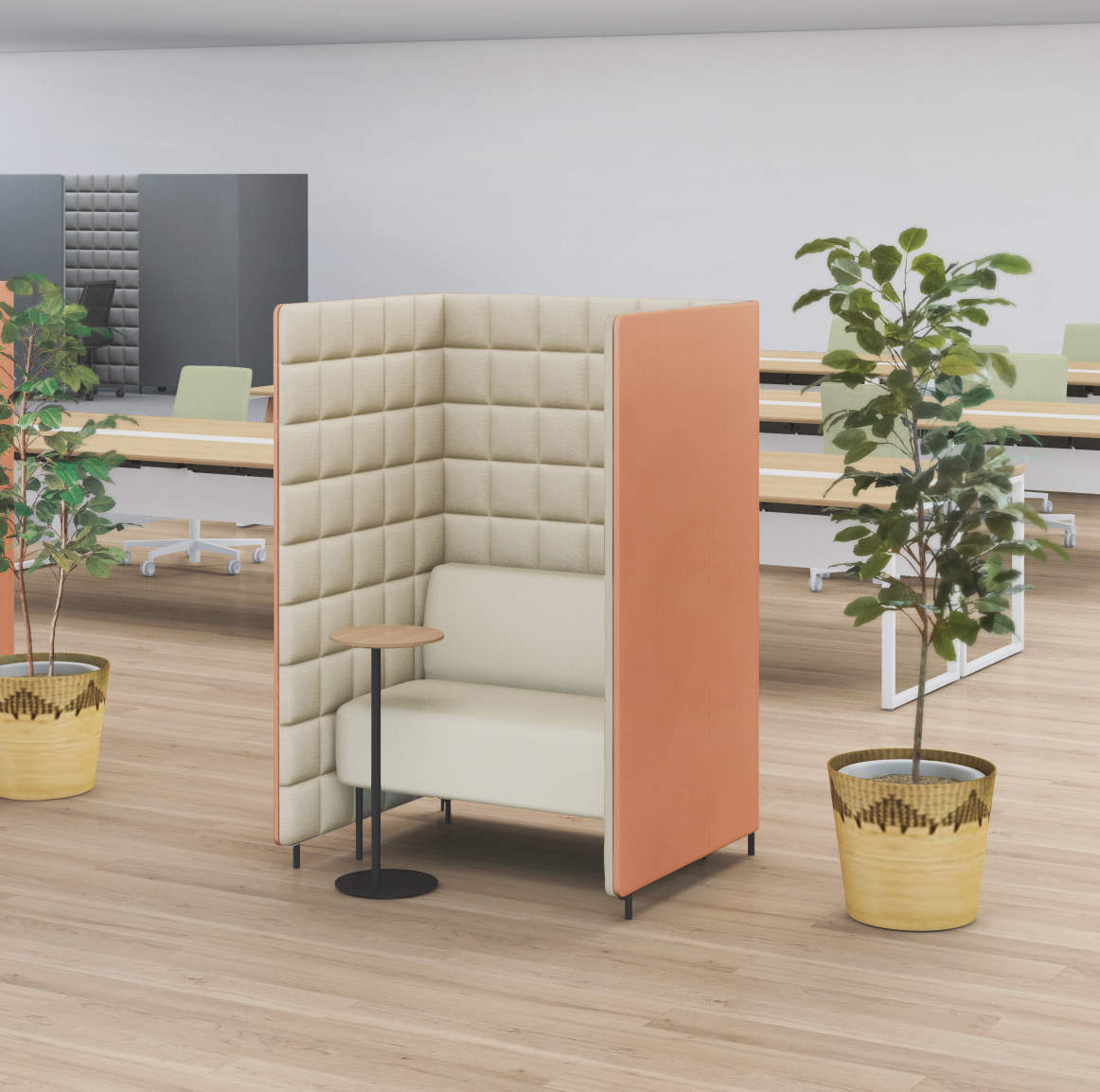 The booth that matters in the world of noise and privacy. The sound absorption features, and coziness encourage conversation between workers. A panel booth system that takes the sound environment into consideration.